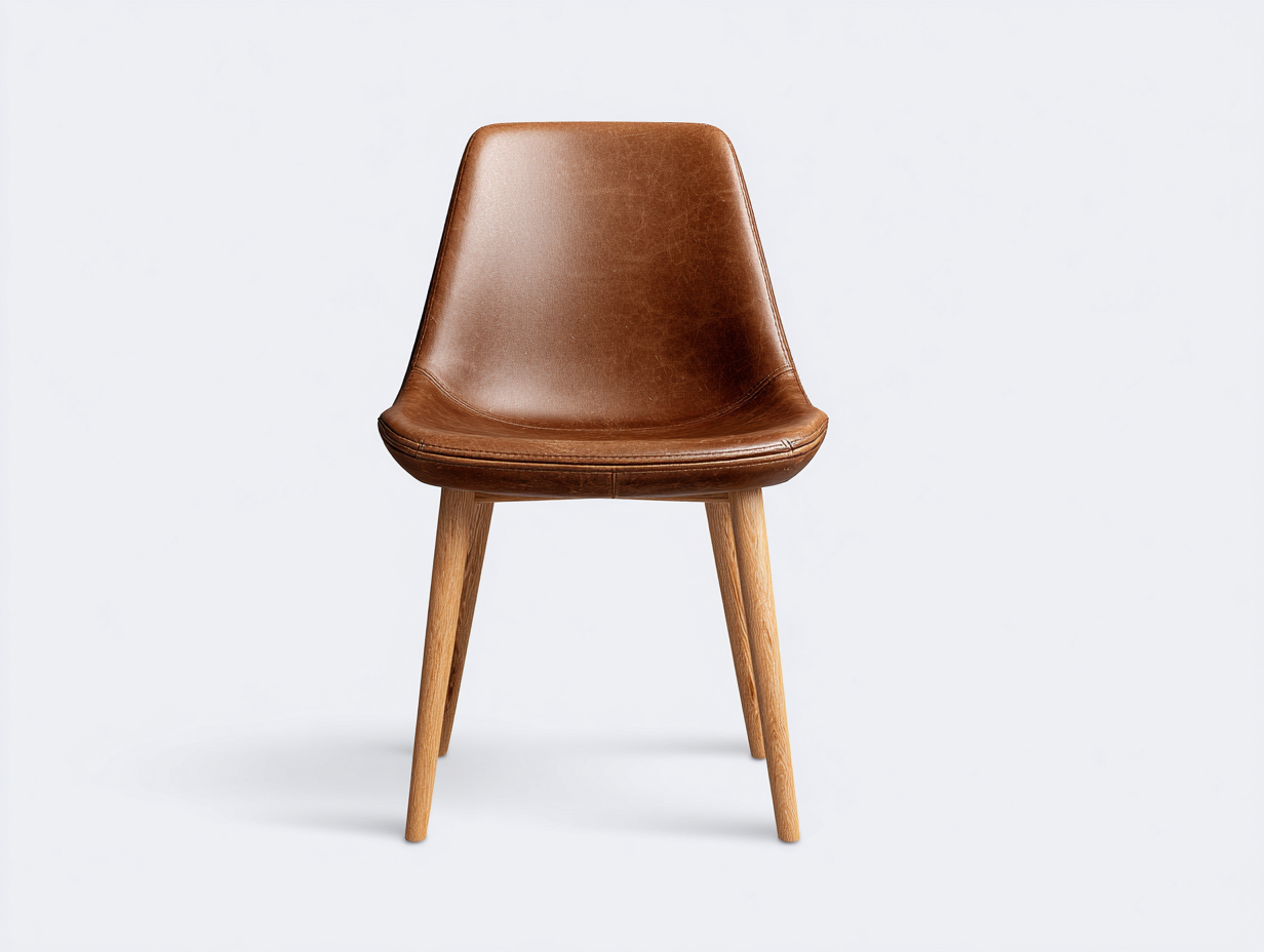 Die Sitzschale ist mit braunem Kunstleder bezogen und weich gepolstert, wodurch ein angenehmes Sitzgefühl entsteht. Die Oberfläche wirkt pflegeleicht und langlebig. Die stabilen Beine aus Naturholz sorgen für eine solide Konstruktion und unterstreichen das natürliche Erscheinungsbild des Stuhls.