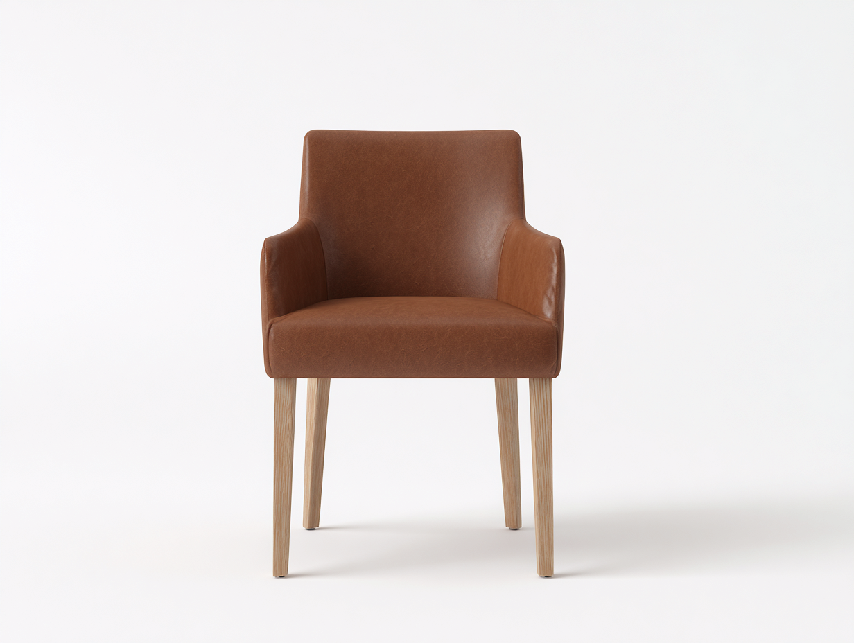 Die Sitzschale ist mit braunem Kunstleder bezogen und weich gepolstert. Das Material wirkt hochwertig und pflegeleicht. Die stabilen Beine aus Naturholz sorgen für eine zuverlässige Standfestigkeit und ergänzen das warme Erscheinungsbild des Stuhls.