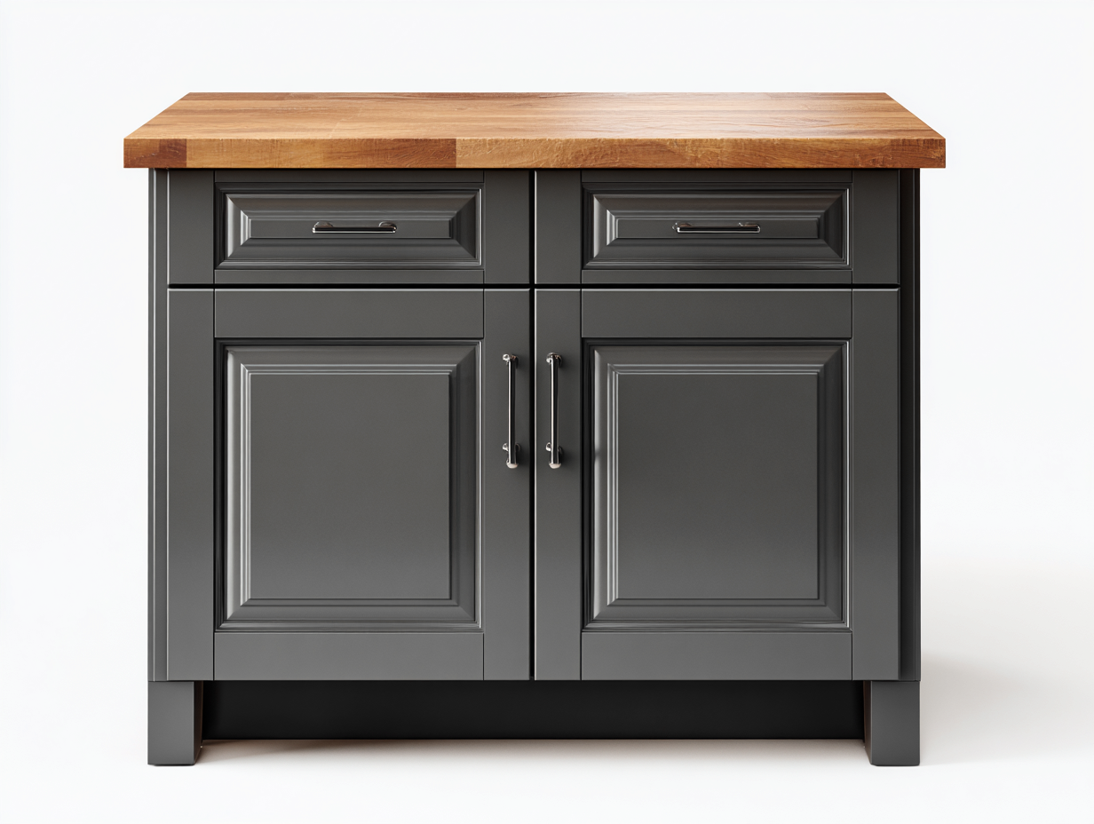 Der Korpus besteht aus robustem Holzwerkstoff mit einer langlebigen dunkelgrauen Oberfläche. Die obere Platte aus naturfarbenem Holz bietet eine stabile und widerstandsfähige Ablagefläche für alltägliche Gegenstände. Metallgriffe ermöglichen ein komfortables Öffnen der Türen und Schubladen und ergänzen das klassische Design.