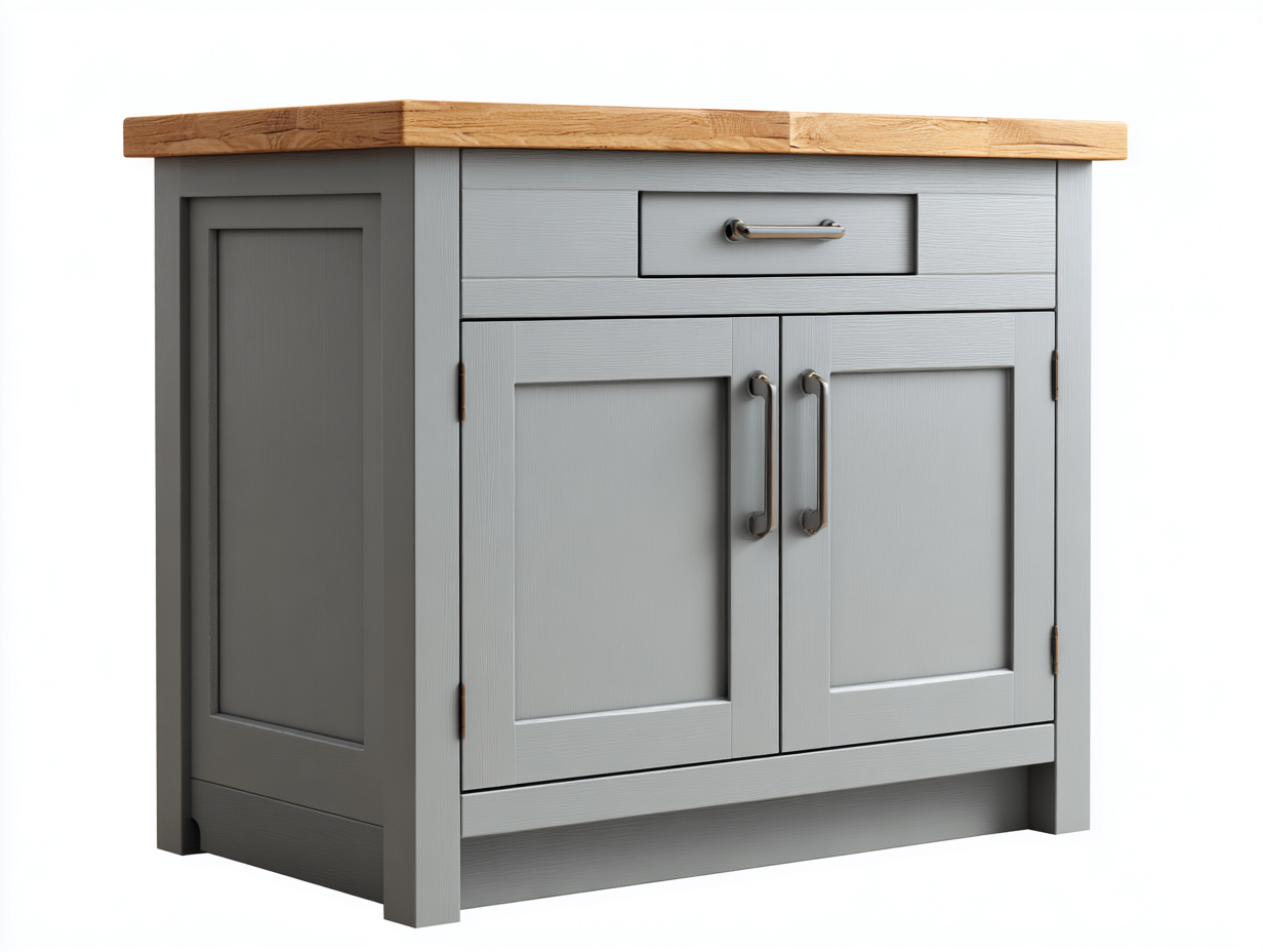 Der Korpus besteht aus stabilem MDF mit grauer Oberfläche. Die obere Abdeckplatte in Naturholzoptik bietet eine robuste und dekorative Ablagefläche. Metallgriffe an Türen und Schublade ergänzen das schlichte Erscheinungsbild und sorgen für eine komfortable Nutzung.